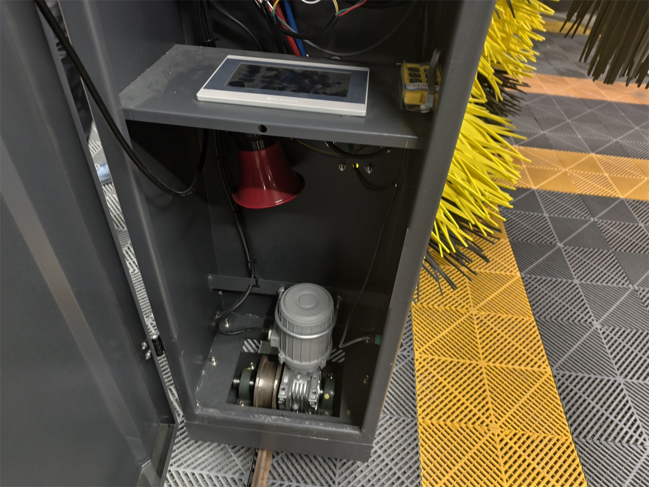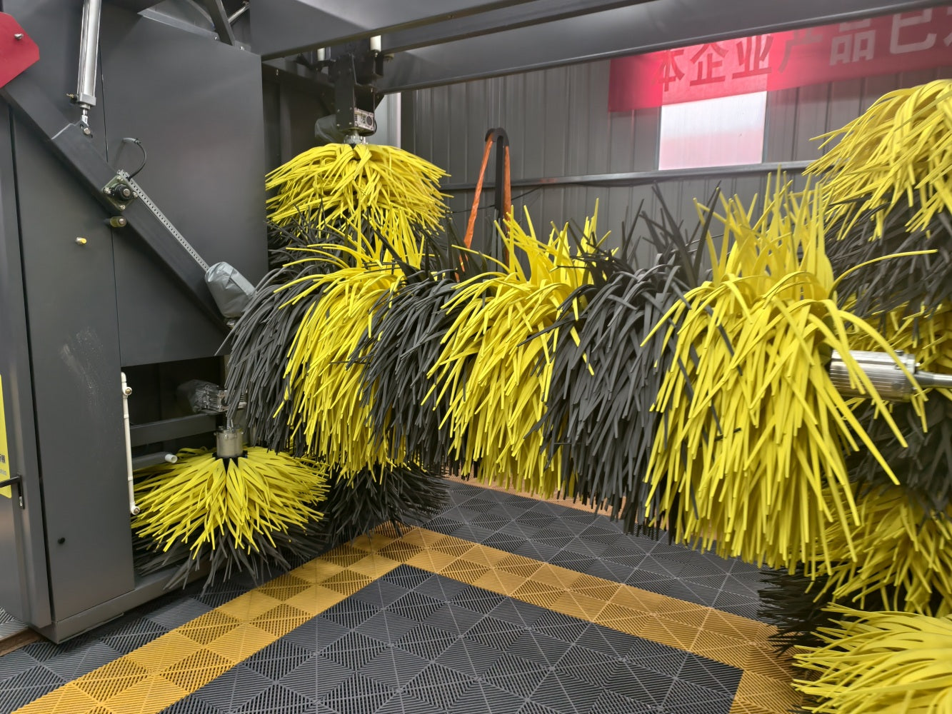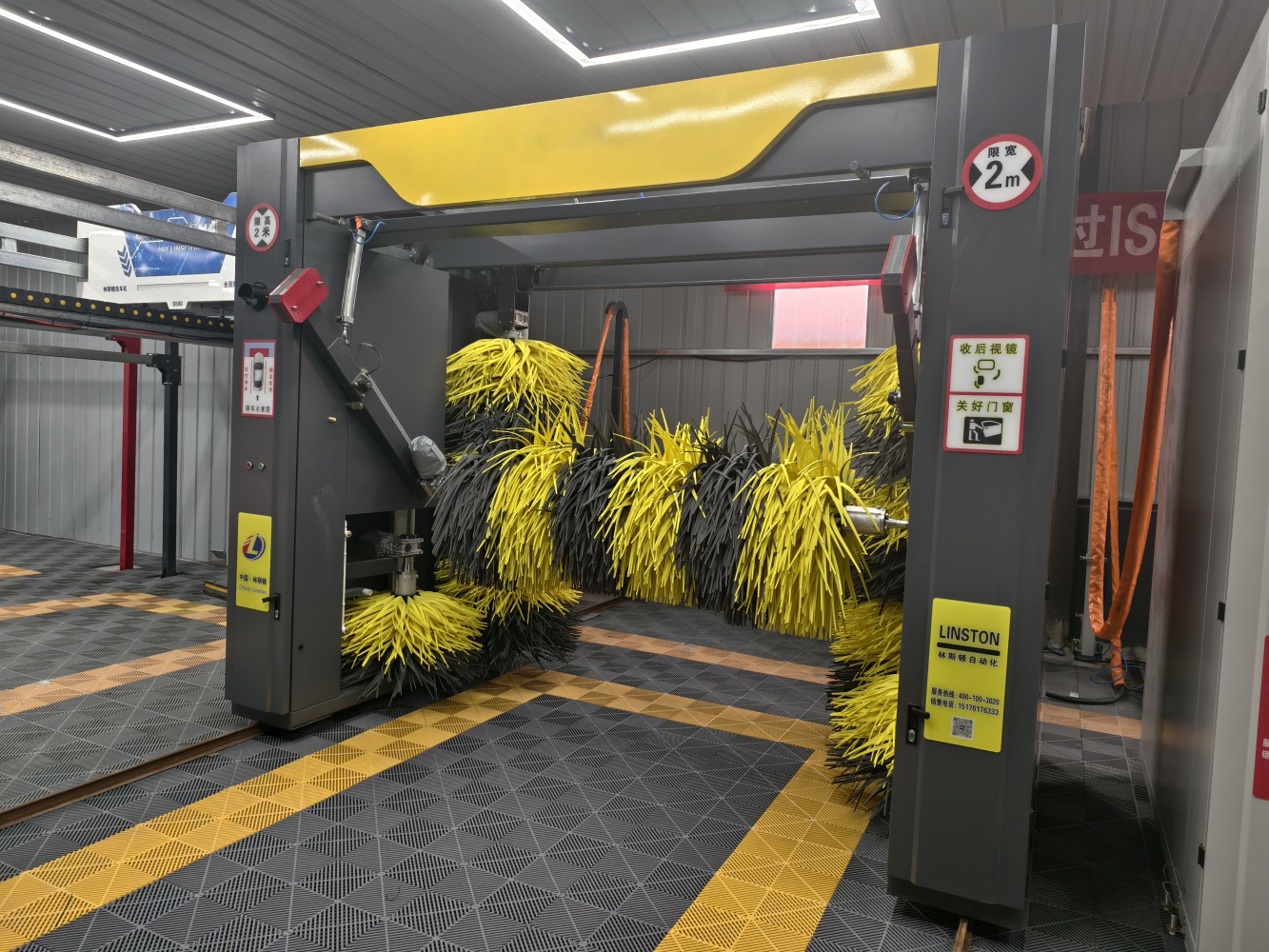 3. After starting, the machine enters the cleaning cycle, activating the brush cleaning system, which washes the vehicle from the front to the rear. The cleaning process begins with a spray of water and foam wax. Once the sensor detects the rear of the vehicle, the car wash begins a second wash from the rear to the front, using both the water spray and brush systems until the front of the vehicle is fully cleaned.